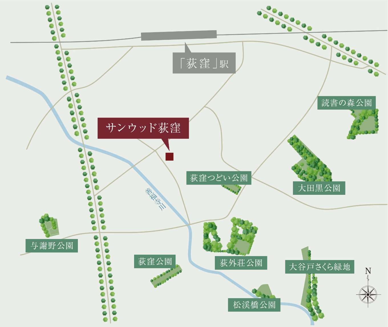 1.大田黒公園(徒歩7分/約540m) 2.天沼弁天池公園(徒歩9分/約650m) 3.読書の森公園(徒歩11分/約820m) 4.西郊ロッヂング(徒歩9分/約700m) 5.善福寺川緑地(徒歩16分/約1,230m) 6.明治天皇荻窪御小休所(徒歩7分/約520m) 7.荻窪八幡神社(徒歩24分/約1,920m)
